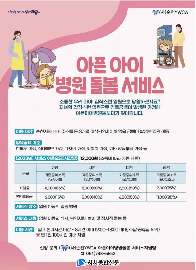 ¾ÆÇ¾ÆÀÌ º´¿øµ¹º½ ¼ºñ½º °ü·Ã ¹®ÀÇ´Â (»ç)¼øÃµYWCA(061-744-5852)·Î ÇÏ¸é µÈ´Ù.