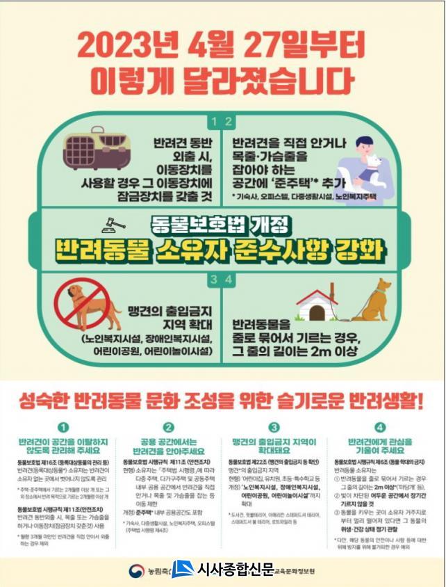 °³Á¤µÈ ÁÖ¿ä ³»¿ëÀº ¡ã¹Ý·Á°ß µ¿¹Ý ¿ÜÃ⠽à À̵¿ÀåÄ¡¿¡ ´ëÇÑ Àá±ÝÀåÄ¡, ¡ãµ¿¹°À» Á÷Á¢ ¾È°Å³ª ¸ñÁÙ¡¤°¡½¿ÁÙÀ» Àâ¾Æ¾ß ÇÏ´Â °ø°£¿¡ ±â¼÷»ç ¿ÀÇǽºÅÚ µî¡®ÁØÁÖÅá¯Ãß°¡, ¡ã¹Ý·Áµ¿¹°À» 2m ¹Ì¸¸ ªÀº ÁÙ·Î ¹¾î¼ »çÀ° ±ÝÁö, ¡ã¸Í°ßÀÇ ÃâÀÔ±ÝÁö Áö¿ª È®´ë µîÀÌ´Ù.