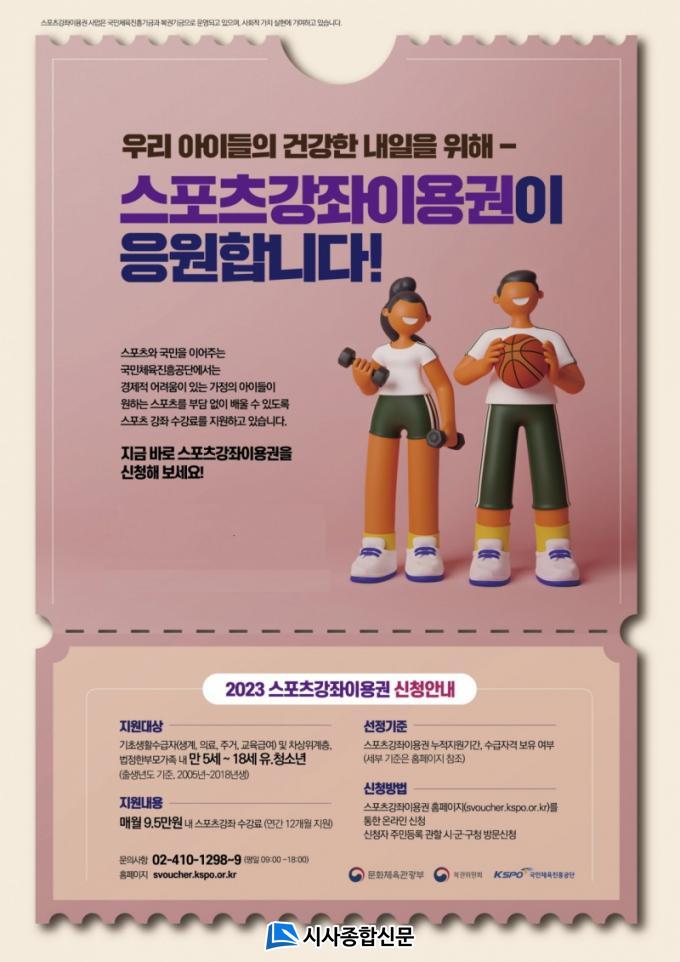 ½ºÆ÷Ã÷ °Á ÀÌ¿ë±Ç Áö¿ø »ç¾÷Àº ¿©°¡ ½ºÆ÷Ã÷ Ȱµ¿¿¡ ´ëÇØ Ãë¾à °èÃþ¿¡°Ô °øÁ¤ÇÑ ±âȸ¸¦ Á¦°øÇϱâ À§ÇÑ »ç¾÷À¸·Î, °¡¸Í üÀ°½Ã¼³ ÀÌ¿ë ½Ã 1ÀÎ´ç ¿ù ÃÖ´ë 9¸¸ 5õ ¿øÀ» ÃÖ´ë 12°³¿ù±îÁö º¸Á¶±ÝÀ¸·Î Áö¿øÇÑ´Ù.