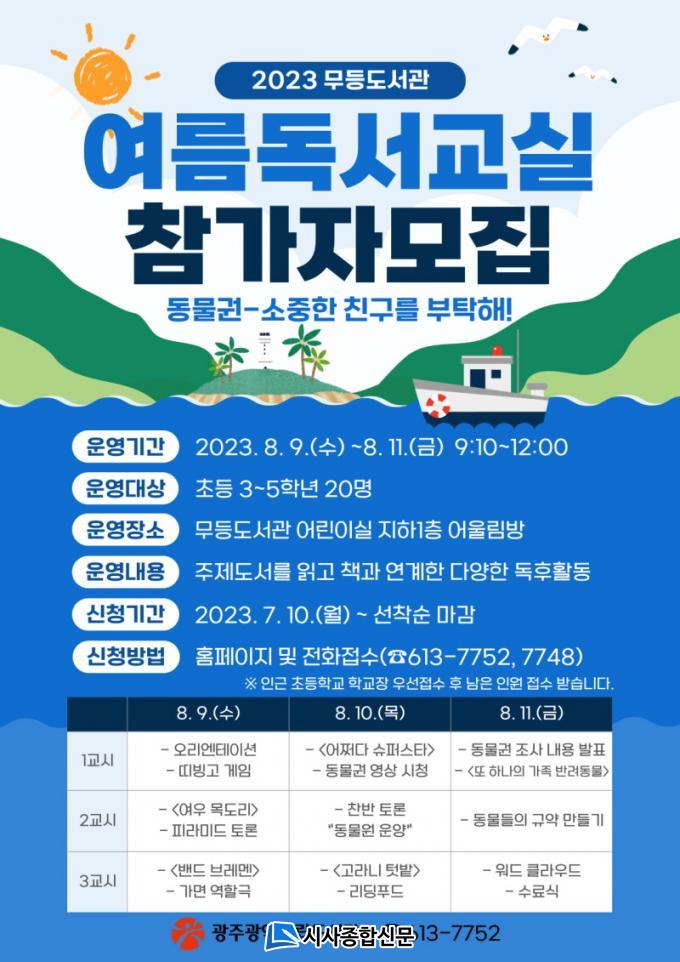 ¿©¸§µ¶¼±³½Ç Âü¿© Á¢¼ö´Â ¿À´Â 10ÀϺÎÅÍ ½Ã¸³µµ¼°ü ´©¸®Áý(https://citylib.gwangju.kr/) ¡®¹®ÈÇà»ç¡¯¶õ¿¡¼ ¼±Âø¼øÀ¸·Î ¹Þ´Â´Ù. ¼ö°·á´Â ¹«·á´Ù. °ÁÂ¿Í °ü·ÃÇÑ ³»¿ëÀº ´©¸®Áý °øÁö»çÇ×À» Âü°íÇϰųª ¹«µî(062-613-7752), »çÁ÷(062-613-7779), »ê¼ö(062-613-7814)µµ¼°üÀ¸·Î ¹®ÀÇÇÏ¸é µÈ´Ù.