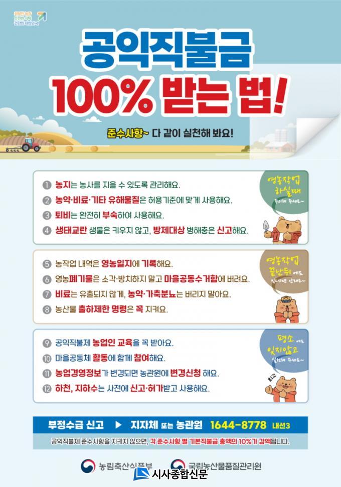 °øÀÍÁ÷ºÒ±Ý ½Åû ³óÁö¡¤³ó¾÷ÀÎÀ» ´ë»óÀ¸·Î ÀÚ°Ý¿ä°Ç °ËÁõ°ú Áؼö»çÇ× ÀÌÇà ¿©ºÎ¸¦ Á¡°ËÇÑ ÈÄ 10¿ù Áß Áö±Þ ´ë»óÀÚ ¹× Áö±Þ ±Ý¾×À» È®Á¤Çϰí 11¿ù²² ³ó¾÷Àο¡°Ô °øÀÍÁ÷ºÒ±ÝÀ» Áö±ÞÇÒ °èȹÀÌ´Ù.