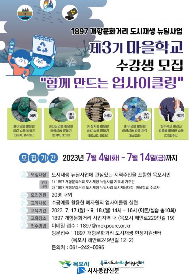 ±³À°Àº ¿À´Â 7¿ù 17ÀϺÎÅÍ 9¿ù 18ÀϱîÁö ¸ÅÁÖ ¿ù¿äÀÏ(14:00~16:00) 10ȸ¿¡ °ÉÃÄ ÁøÇàµÉ ¿¹Á¤ÀÌ´Ù. ÁÖ¿ä ±³À°³»¿ëÀº ¹ö·Á¾ß ÇÒ Á¦Ç°¿¡ µðÀÚÀÎÀ̳ª Ȱ¿ëµµ¸¦ ´õÇØ ±× °¡Ä¡¸¦ ³ôÀÌ´Â »õȰ¿ë¿¡ ´ëÇÑ À̷мö¾÷°ú ¸ñÆ÷Ç×±¸¿¡¼ Ȱ¿ëµÇ´Â ¾î¸Á, ¾î»óÀÚ, ¹æ¼öÀÛ¾÷º¹, ¹Ù´Ù À¯¸® µî ÆóÀÚ¿øÀ» Ȱ¿ëÇÑ »ýȰ¿ëǰ ¹× °ü±¤»óǰ ¸¸µé±â µî ¼ö°ø¿¹ ½Ç½ÀÀ¸·Î ±¸¼ºµÇ¾ú´Ù. ¸¶À»Çб³ ±³À°ÇÁ·Î±×·¥ µî¿¡ °üÇÑ ÀÚ¼¼ÇÑ »çÇ×Àº ¸ñÆ÷½Ãû ȨÆäÀÌÁö(www.mokpo.go.kr)¿¡¼ È®ÀÎÇÒ ¼ö ÀÖÀ¸¸ç, 1897 °³Ç×¹®È°Å¸® µµ½ÃÀç»ýÇöÀåÁö¿ø¼¾ÅÍ(242-0095)·Î ¹®ÀÇÇÏ¸é µÈ´Ù.