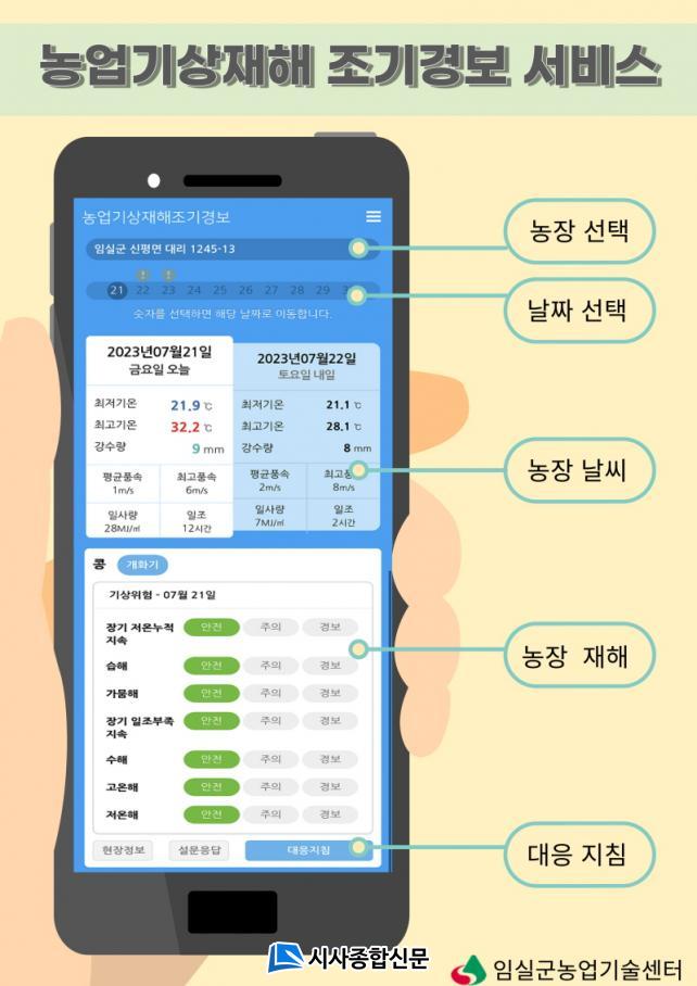 ³ó¾÷±â»óÀçÇØ Á¶±â°æº¸¼ºñ½º¶õ ³óÃÌÁøÈïû¿¡¼ °³¹ßµÈ¡®±¹Áö±â»ó ¿¹Ãø ±â¼ú¡¯°ú¡®±â»ó À§Çè ÆÇÁ¤ ±â¼ú¡¯À» Ȱ¿ëÇÏ¿© ³óÀå ´ÜÀ§ ³¯¾¾ Á¤º¸¿Í ÀçÇØÁ¤º¸ ¹× ´ëÀÀ ÁöħÀ» ÀÎÅͳݰú ¸ð¹ÙÀÏÀ» ÅëÇØ Á¦°øÇÏ´Â ¼ºñ½ºÀÌ´Ù.