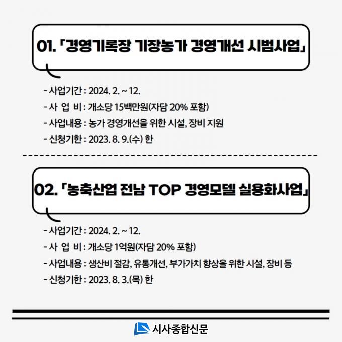 ÀÚ¼¼ÇÑ ³»¿ëÀº ³ó¾÷±â¼ú¼¾ÅÍ È¨ÆäÀÌÁö¸¦ ÅëÇØ È®ÀÎÇÒ ¼ö ÀÖ´Ù. ½Åû ±âÇÑÀº ¡®³óÃà»ê¾÷ Àü³² TOP °æ¿µ¸ðµ¨ ½Ç¿ëÈ »ç¾÷¡¯Àº 8¿ù 3ÀÏ, ¡®°æ¿µ±â·ÏÀå ±âÀå ³ó°¡ °æ¿µ°³¼± Áö¿ø»ç¾÷¡¯Àº 8¿ù 9ÀϷΠȼø±º³ó¾÷±â¼ú¼¾Å͸¦ ÅëÇØ Á¢¼öÇÑ´Ù.