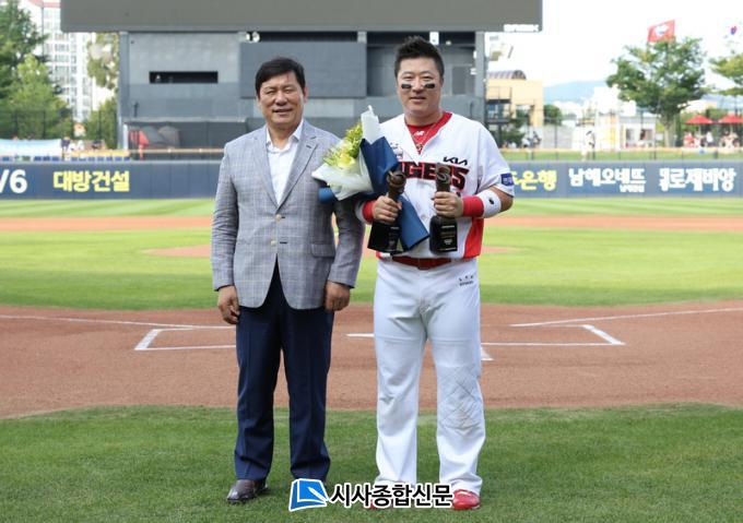 À̳¯ ½Ã»ó½Ä¿¡¼ KIA ŸÀ̰ÅÁî ±¸´ÜÀº °Ý·Á±Ý°ú »óÆÐ, ÃàÇÏ ²É´Ù¹ßÀ» Àü´ÞÇß°í, KBO Ç㱸¿¬ ÃÑÀç°¡ ±â³äÆÐ¿Í ÃàÇÏ ²É´Ù¹ßÀ» °¢°¢ Àü´ÞÇß´Ù.