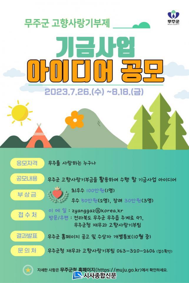 À̹ø °ø¸ð´Â °íÇâ»ç¶û±â±ÝÀÇ »ç¿ëó¸¦ ºÐ¸íÈ÷ ÇÏ°í ´õºÒ¾î ±âºÎÀÚÀÇ °ø°¨À» ºÒ·¯ÀÏÀ¸Å³ ¼ö ÀÖ´Â »ç¾÷À» ¹ß±¼ÇÑ´Ù´Â ÃëÁö¿¡¼ ÃßÁøÇÏ´Â °ÍÀ¸·Î, ¹«ÁÖ±º °íÇâ»ç¶û±âºÎÁ¦¿¡ °ü½ÉÀÌ ÀÖ´Â ±¹¹ÎÀÌ¸é ´©±¸³ª Âü¿©°¡ °¡´ÉÇÏ´Ù.