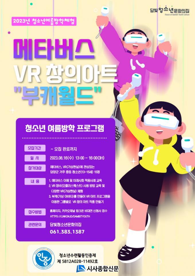 ¡®ºÎij¿ùµå¡¯´Â ¿©¸§¹æÇÐÀ» ¸ÂÀÌÇØ 4Â÷ »ê¾÷±â¼úÀÎ VR(°¡»óÇö½Ç)À» ÀÌ¿ëÇÑ ¿¹¼úÀÛǰÀ» ¸¸µå´Â ÇÁ·Î±×·¥À¸·Î ¿À´Â 8¿ù 9ÀÏ, 8¿ù 16ÀÏ ÃÑ 2ȸ±â·Î ÁøÇàµÇ¸ç Âü¿© û¼Ò³âÀº ´ãºûû¼Ò³â¹®ÈÀÇÁý ȨÆäÀÌÁö, īī¿Àä³Î¿¡¼ ºñ´ë¸éÀ¸·Î ¸ðÁýÇÒ ¿¹Á¤ÀÌ´Ù.