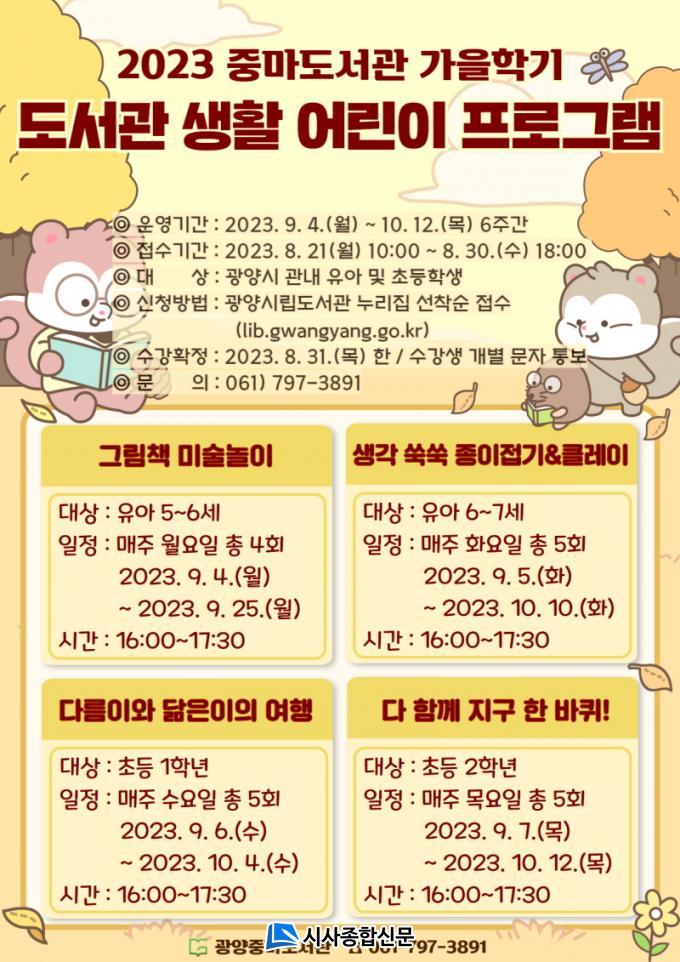 | ±¤¾çÁ߸¶µµ¼°ü, °¡À»Çб⠵µ¼°ü »ýȰ ¾î¸°ÀÌ ÇÁ·Î±×·¥ ¼ö°»ý ¸ðÁý 9¿ù 4ÀϺÎÅÍ 6ÁÖ µ¿¾È ¿¬·Éº° 4°³ °Á ¿î¿µ |