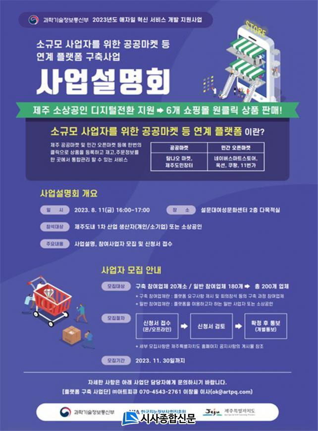 À̹ø »ç¾÷Àº °úÇбâ¼úÁ¤º¸Åë½ÅºÎ°¡ ÁÖ°üÇÑ ¡®23³â ¾ÖÀÚÀÏ Çõ½Å ¼ºñ½º °³¹ß Áö¿ø »ç¾÷¡¯À¸·Î ÃßÁøµÆÀ¸¸ç, »ç¾÷ºñ´Â ÃÑ 4¾ï ¿ø(±¹ºñ Àü¾×)ÀÌ ÅõÀԵƴÙ. Âü¿©±â¾÷ ½ÅûÀ» Èñ¸ÁÇÏ´Â ±â¾÷Àº 11¿ù 30ÀϱîÁö Á¦ÁÖµµ ´©¸®Áý(http://www.jeju.go.kr/index.htm)À» ÅëÇØ ½Åû °¡´ÉÇϸç, º¸´Ù ÀÚ¼¼ÇÑ »çÇ×Àº Ç÷§Æû ±¸Ãà»ç¾÷´Ü(¾ÆÆ®ÇÇÅ¥ ¿î¿µÆÀ ¢Î070-4543-2761)À¸·Î ¹®ÀÇÇÏ¸é µÈ´Ù.