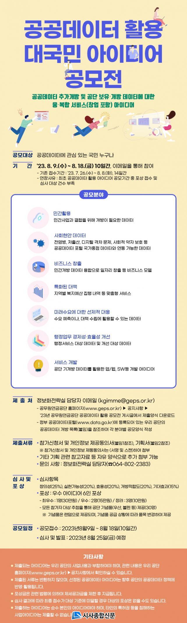 ±¹¹Î ´©±¸³ª Âü¿©ÇÒ ¼ö ÀÖ´Â À̹ø °ø¸ð´Â °ø¹«¿ø¿¬±Ý°ø´Ü ȨÆäÀÌÁö(www.geps.or.kr > ¾Ë¸²°ú ¼ÒÅë > °øÁö»çÇ×) ¡®°ø°øµ¥ÀÌÅÍ È°¿ë ´ë±¹¹Î ¾ÆÀ̵ð¾î °ø¸ðÀü¡¯ °Ô½Ã¹°¿¡¼ Âü°¡½Åû¼ ¹× ±âȹ¼¸¦ ÀÛ¼º ÈÄ À̸ÞÀÏ(kgimme@geps.or.kr)·Î 18ÀϱîÁö Á¢¼öÇÏ¸é µÈ´Ù.