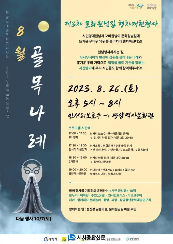 ¡®8¿ù, °ñ¸ñ³ª·Ê¡¯´Â ¿À´Â 26ÀÏ(Åä) ¿ÀÈÄ 5½ÃºÎÅÍ 8½Ã±îÁö ¹®È¿ø´Ô±æ°ú ±¤¾ç¿ª»ç¹®È°ü¿¡¼ ÁøÇàµÇ¸ç, ¹®È¿ø´Ô±æ Ȱ¼ºÈ¸¦ À§ÇØ ¿¹¼ú°¡¿Í ½Ã¹Îµé·Î ÀÌ·ç¾îÁø ½Ã¹Î ±Ã¸®·¦ 10ÆÀÀÌ Ã»³â¹®È±âȹÀÚ¿Í ÇÔ²² ±Ã¸®ÇØ ±âȹÇÏ°í ¿î¿µÇÏ´Â ¼¼¹øÂ° Çà»çÀÌ´Ù.