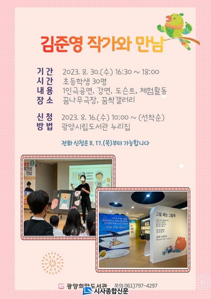 Âü¿©¸¦ ¿øÇÏ´Â ¾î¸°ÀÌ´Â ±¤¾ç½Ã¸³µµ¼°ü ´©¸®Áý(https://lib.gwangyang.go.kr)À» ÅëÇØ ¿À´Â 16ÀϺÎÅÍ ½ÅûÇÒ ¼ö ÀÖÀ¸¸ç, ±âŸ ¹®ÀÇ´Â Èñ¸Áµµ¼°üÀ¸·Î ÀüÈ(¢Ï 797-4297)ÇÏ¸é µÈ´Ù.