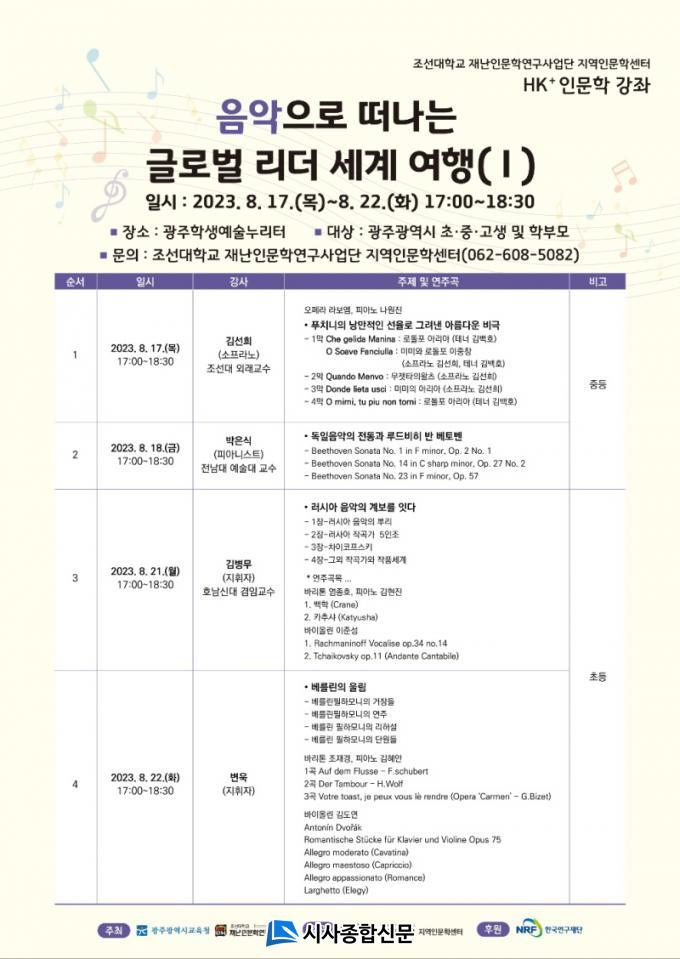 ¿ì¼± 17ÀÏ¿¡´Â ¼ÒÇÁ¶ó³ë ±è¼±Èñ Á¶¼±´ë ¿Ü·¡±³¼ö°¡ Ǫġ´ÏÀÇ ¿ÀÆä¶ó ¡®¶óº¸¿¥¡¯À» ÁÖÁ¦·Î °¿¬ÇÑ´Ù. ´ÙÀ½³¯ÀÎ 18ÀÏ °¿¬¿¡¼´Â ÇǾƴϽºÆ® ¹ÚÀº½Ä Àü³²´ë ±³¼ö°¡ ¡®µ¶ÀÏÀ½¾ÇÀÇ ÀüÅë°ú ·çµåºñÈ÷ ¹Ý º£Å亥¡¯¶ó´Â ÁÖÁ¦¸¦ ÅëÇØ º£Å亥 ¼Ò³ªÅ¸¸¦ ÅëÇØ µ¶ÀÏÀÇ À½¾ÇÀû Ư¼º¿¡¼ °üÇØ ¾Ë·ÁÁØ´Ù.