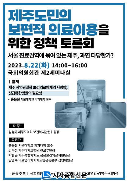 ÇÑÆí, À̹ø Åä·Ðȸ´Â À§¼º°ï¡¤¼ÛÀçÈ£¡¤±èÇÑ±Ô ÀÇ¿ø µî Á¦ÁÖ ±¹È¸ÀÇ¿ø 3Àΰú ±¹È¸ º¸°Çº¹ÁöÀ§¿øÈ¸ À§¿øÀå ½Åµ¿±Ù ÀÇ¿ø, °£»ç °í¿µÀÎ ÀÇ¿ø, ±è¿µÁÖ‧¼¿µ¼® ÀÇ¿øÀÌ °øµ¿ÁÖÃÖÇßÀ¸¸ç, ±è°æ¹Ì Á¦ÁÖµµÀÇȸ º¸°Çº¹Áö¾ÈÀüÀ§¿øÀåÀÌ ÁÂÀåÀ» ¸Ã´Â´Ù. ¶ÇÇÑ, È«À±Ã¶ ¼¿ï´ë ±³¼ö, ±è¿ìÁ¤ Á¦Áִ뺴¿ø Áø·áºÎ¿øÀå, ¹ÚÇü±Ù Á¦ÁÖµµ °ø°øº¸°ÇÀÇ·áÁö¿ø´ÜÀå, ¾ç¿µ¼ö ÀǷ῵¸®ÈÀúÁöµµ¹Î¿îµ¿º»ºÎ ÁýÇàÀ§¿øÀå µîÀÌ Âü¼®ÇØ ¹ßÁ¦¿Í Åä·ÐÀ» ÁøÇàÇÒ ¿¹Á¤ÀÌ´Ù.