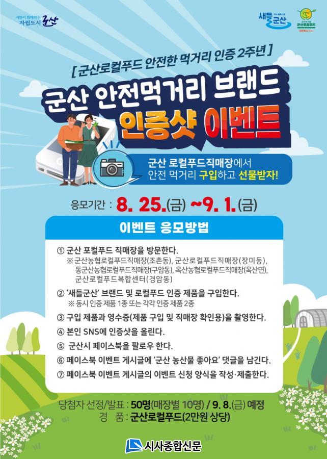 ½Ã´Â 2021³âºÎÅÍ Áö¿ª ¿ì¼ö ³ó»ê¹°¿¡ »ý»êÀÚ Á¤º¸¿Í »ý»ê ¹× ǰÁú °ü¸® ü°èÀÇ ÀÏÁ¤ÇÑ ±âÁØÀ» Åë°úÇß´Ù´Â ÀÎÁõ¸¶Å©¸¦ Ç¥½ÃÇÏ´Â ±º»ê ·ÎÄÃǪµå ÀÎÁõÁ¦¸¦ ¿î¿µÇϰí ÀÖ´Ù. À̹ø SNS ÀÎÁõ¼¦ À̺¥Æ®´Â ÀÎÁõÁ¦ µµÀÔ 2ÁÖ³âÀ» ¸Â¾Æ ÁøÇàÇÏ°Ô µÆÀ¸¸ç ±º»ê½Ã¹Î µî ±º»ê½Ã ÆäÀ̽ººÏ ÆÈ·Î¿ö¶ó¸é ´©±¸³ª Âü¿© °¡´ÉÇÏ´Ù.