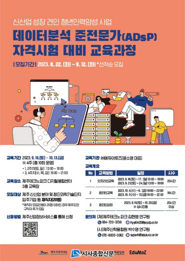 Á¦ÁÖÅ×Å©³ëÆÄÅ©´Â Á¦ÁÖÆ¯º°ÀÚÄ¡µµ, Á¦ÁÖ»êÇÐÀ¶ÇÕ¿ø°ú ÇÔ²² ¡®µ¥ÀÌÅͺм® ÁØÀü¹®°¡(ADsP) ÀڰݽÃÇè ´ëºñ ±³À°°úÁ¤¡¯ Âü°¡ÀÚ 20¸íÀ» ´ÙÀ½´Þ 12ÀϱîÁö ¸ðÁýÇÑ´Ù°í 21ÀÏ ¹àÇû´Ù. ´ë»óÀº Á¦ÁÖ ½Å»ê¾÷ ºÐ¾ß ¹× ÷´Ü°úÇбâ¼ú´ÜÁö ÀÔÁÖ±â¾÷ ÀçÁ÷ÀÚ µîÀÌ´Ù.
