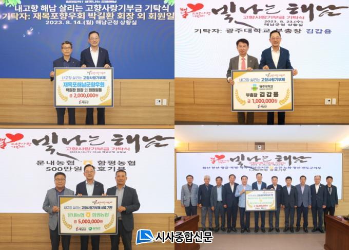 Áö³ 8¿ù 14ÀÏ Àç¸ñÆ÷ÇØ³²Çâ¿ìȸ(ȸÀå ¹Ú±æÈ¯)¿¡¼ °íÇâ»ç¶û±âºÎ±Ý 200¸¸¿øÀ» ±âŹÇß´Ù. À̹ø ±âºÎ´Â Áö³ 4¿ù 1,210¸¸¿ø¿¡ ÀÌ¾î µÎ ¹øÂ°·Î, °íÇâ ¹ßÀüÀ» À§ÇÑ Çâ¿ìȸ¿øµéÀÇ Á¤¼ºÀ» ´Ù½ÃÇѹø ¸ð¾Ò´Ù.