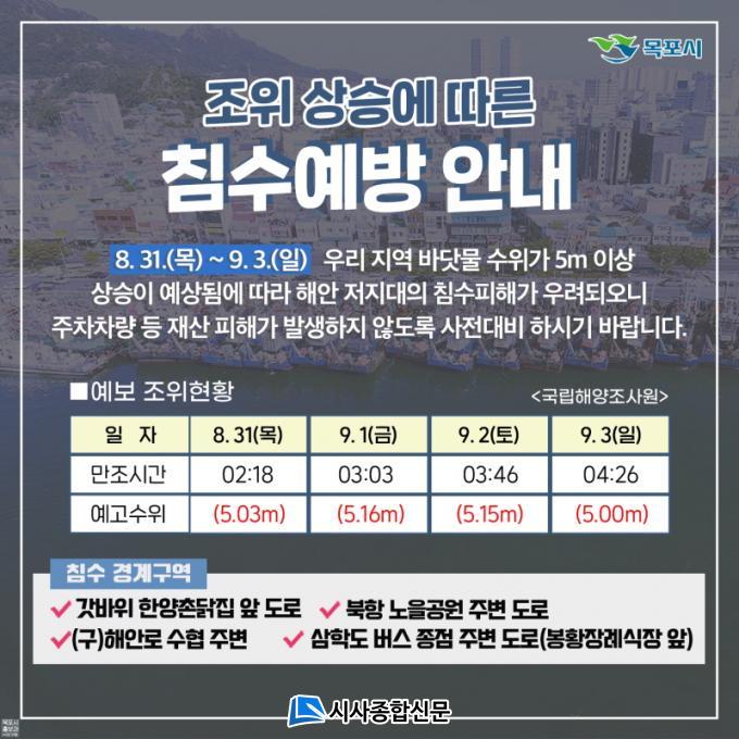 [½Ã»çÁ¾ÇսŹ® = ¿À½ÂÅà ±âÀÚ] ¸ñÆ÷½Ã´Â ´ëÁ¶±âÀÎ ¿À´Â 31ÀϺÎÅÍ 9¿ù 3ÀÏ(¿ÀÀü 2½Ã ~ 7½Ã) »çÀÌ ¹Ù´å¹° ¼öÀ§°¡ 5.1m ÀÌ»ó (Á¶¼®Ç¥»ó 9/1 ÃÖ°í 5.16m) »ó½Â ¿¹»óµÊ¿¡ µû¶ó ÇÇÇØ¸¦ ÀÔÁö ¾Êµµ·Ï öÀúÇÑ ´ëºñ¸¦ ´çºÎÇß´Ù.