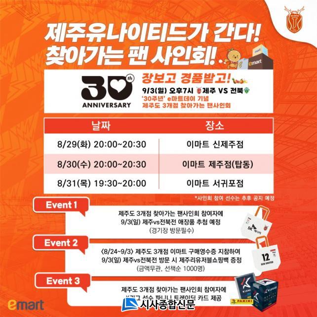 À̹ø ã¾Æ°¡´Â ÆÒ »çÀÎȸ´Â Á¦ÁÖµµ³» À̸¶Æ® 3°³ ÁöÁ¡(¼±ÍÆ÷Á¡, ½ÅÁ¦ÁÖÁ¡, Á¦ÁÖÁ¡)¿¡¼ ÁøÇàÇÑ´Ù. 8¿ù 29ÀÏ(È) À̸¶Æ® ½ÅÁ¦ÁÖÁ¡(¿ÀÈÄ 8½Ã~8½Ã30ºÐ)À» ½ÃÀÛÀ¸·Î 8¿ù 30ÀÏ(¼ö)¿¡´Â À̸¶Æ® Á¦ÁÖÁ¡(¿ÀÈÄ 8½Ã~8½Ã30ºÐ), 8¿ù 31ÀÏ(¸ñ)¿¡´Â À̸¶Æ® ¼±ÍÆ÷Á¡(8½Ã~8½Ã30ºÐ)¿¡¼ 3ÀÏ ¿¬¼ÓÀ¸·Î ¿¸°´Ù. ã¾Æ°¡´Â ÆÒ »çÀÎȸ¿¡ Âü¼®ÇÏ´Â ¼±¼ö ¸í´ÜÀº Çà»ç ´çÀÏ ±¸´Ü SNS¸¦ ÅëÇØ °øÁöµÉ ¿¹Á¤ÀÌ´Ù.