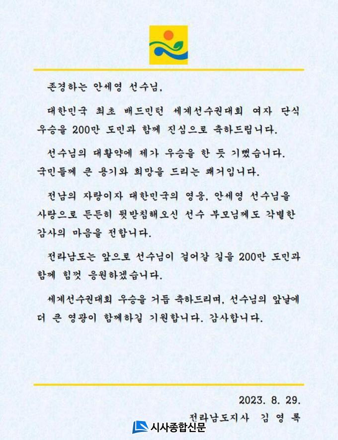 ±è¿µ·Ï Àü³²µµÁö»ç´Â 29ÀÏ ¾È¼¼¿µ ¼±¼ö¿¡°Ô Àü³²µµ¹ÎÀÇ ¸¶À½À» ´ã¾Æ ÃàÀüÀ» º¸³Â´Ù.
