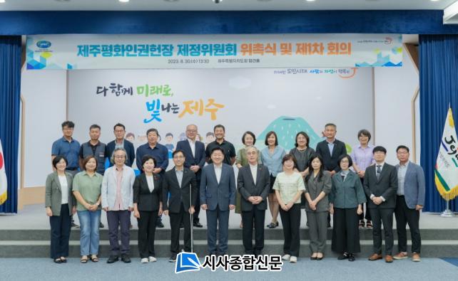 ¡®Á¦ÁÖÆòÈÀαÇÇåÀå Á¦Á¤À§¿øÈ¸ À§ÃË½Ä ¹× Á¦1Â÷ ȸÀÇ¡¯°¡ À̳¯ ¿ÀÈÄ 1½Ã 30ºÐ Á¦ÁÖµµÃ» º»°ü 4Ãþ ޶óȦ¿¡¼ °³ÃֵƴÙ. Á¦ÁÖÆòÈÀαÇÇåÀå Á¦Á¤À§¿øÈ¸´Â ¹Î¼±8±â µµÁö»ç °ø¾à 7´ë ÇٽɰúÁ¦ Áß ÇϳªÀÎ µµ¹ÎÂü¿©Çü Á¦ÁÖÆòÈÀαÇÇåÀåÀ» Á¦Á¤Çϱâ À§ÇØ °¢°è°¢ÃþÀÇ ´Ù¾çÇÑ ÀǰßÀ» ¼ö·ÅÇϰí, µµ¹ÎÂü¿©¸¦ ÅëÇÑ »çȸÀû °ø°¨´ë¸¦ Çü¼ºÇϱâ À§ÇØ ±¸¼ºµÆ´Ù.