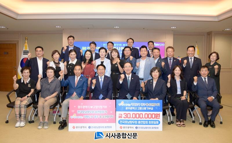 Àü±¹È£³²Çâ¿ìȸ´Â ȸ¿øµéÀÇ ¶æÀ» ¸ð¾Æ ¸ð±ÝÇÑ °íÇâ»ç¶û±âºÎ±Ý 3000¸¸¿øÀ» ±¤Áֽÿ¡ ±âŹÇϸç, ±¤Áֽô °íÇâ¹ßÀüÀ» À§ÇØ ±âºÎÇà·Ä¿¡ µ¿ÂüÇÑ Àü±¹È£³²Çâ¿ìȸÃÑ¿¬ÇÕȸ¿¡ °¨»çÆÐ¸¦ ÁõÁ¤Çß´Ù.