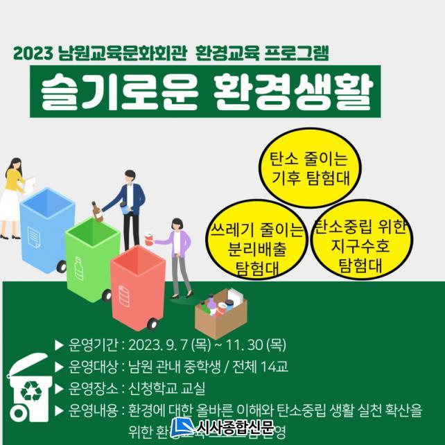 [½Ã»çÁ¾ÇսŹ® = ¿À½ÂÅà ±âÀÚ] ³²¿ø±³À°¹®Èȸ°ü(°üÀå ¹Ú¼öÁø)Àº ȯ°æ¿¡ ´ëÇÑ ¿Ã¹Ù¸¥ Àνİú ź¼ÒÁ߸³ ½Çõ ¹®È Á¶¼ºÀ» À§ÇØ °ü³» ÁßÇлýÀ» ´ë»óÀ¸·Î ã¾Æ°¡´Â ȯ°æ±³À° ÇÁ·Î±×·¥ ¡®½½±â·Î¿î ȯ°æ»ýȰ¡¯À» ¿À´Â 7ÀÏ(¸ñ)ºÎÅÍ ¿î¿µÇÑ´Ù.