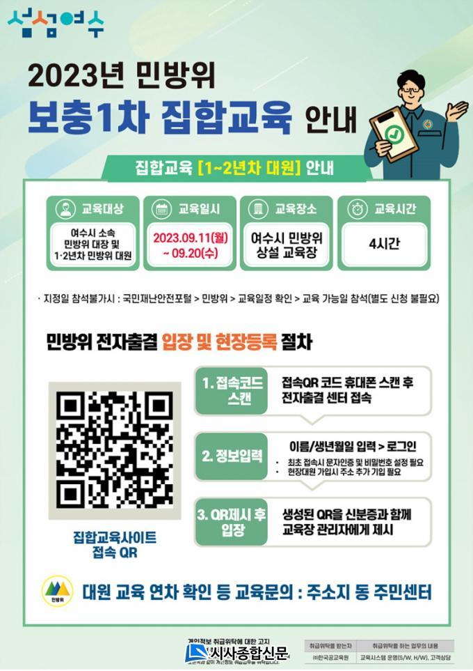 ±³À°Àº ¼±¿øµ¿ ¼ÒÀç ¹Î¹æÀ§ »ó¼³±³À°Àå¿¡¼ ¿ù~±Ý¿äÀÏ ¿ÀÈÄ 2~6½Ã 2ȸÂ÷·Î ¿î¿µµÇ¸ç, ¹Î¹æÀ§ Á¦µµ․È»ý¹æ ´ëÀÀ․ÈÀç ¹× ÁöÁø ´ëÇÇ․ÀÀ±Þóġ(½ÉÆó¼Ò»ý¼ú) µî 4°³ °ú¸ñÀ¸·Î ÁøÇàµÈ´Ù. Ÿ ½Ã․±º․±¸¿¡ ÁÖ¼Ò¸¦ µÐ ¹Î¹æÀ§´ë¿øµµ ±³À° ÀÀ¼Ò°¡ °¡´ÉÇÏ¸ç ´Ù¸¥ Áö¿ª¿¡ ÃâÅ¸ÇØ ÀÀ¼ÒÇÒ ¼ö ¾ø´Â °æ¿ì¿¡´Â ÇöÁö(ü·ùÁö)¿¡¼ ½Ç½ÃÇÏ´Â ±³À°À» ¹ÞÀ» ¼öµµ ÀÖ´Ù.