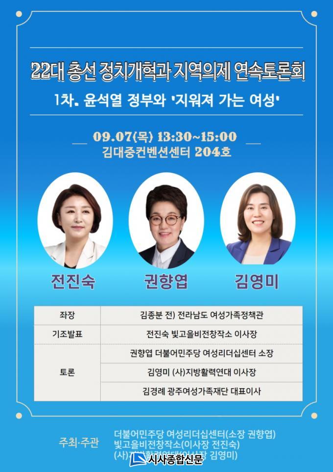 À̵éÀº ´õºÒ¾î¹ÎÁÖ´ç ¿©¼º¸®´õ½Ê¼¾ÅÍ, ºû°íÀ»ºñÀüâÀÛ¼Ò, (»ç)Áö¹æÈ°·Â¿¬´ë °øµ¿ÁÖÃÖ·Î [22´ë ÃѼ± Á¤Ä¡°³Çõ°ú Áö¿ªÀÇÁ¦ ¿¬¼ÓÅä·Ðȸ]¸¦ 3Â÷·Ê¿¡ °ÉÃÄ ÁøÇàÇÒ ¿¹Á¤À̸ç, ù ¹øÂ° Åä·Ðȸ¸¦ ±¤ÁÖ¿¡¼ °³ÃÖÇß´Ù. ÀÌÈÄ ±¤¾ç, ´ã¾ç µî¿¡¼µµ °³ÃÖ µÉ ¿¹Á¤ÀÌ´Ù.