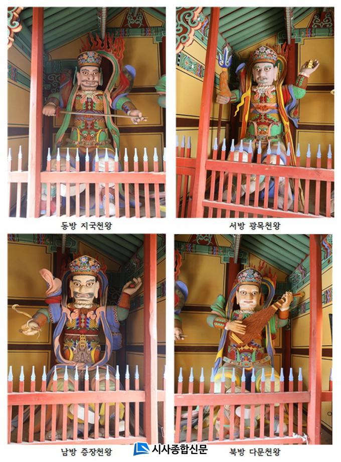 »çõ¿Õ»óÀº Àý(ÞÑ) ÀÔ±¸ õ¿Õ¹®¿¡ ºÀ¾ÈµÇ¾î »çÂû°ú ´ëÁßÀ» ÁöŰ´Â ¿ªÇÒÀ» Çϴ ȣ¹ý½ÅÀÌ´Ù. °¢ ¹æÇâ¿¡ µû¶ó µ¿ÂÊÀº Áö±¹Ãµ¿Õ, ¼ÂÊÀº ±¤¸ñõ¿Õ, ³²ÂÊÀº ÁõÀåõ¿Õ, ºÏÂÊÀº ´Ù¹®Ãµ¿ÕÀ¸·Î ºÒ¸®¸ç, °¢°¢ º¸°Ë, º¸´ç(±ê¹ß ´Þ¸° â), ¿ë°ú ¿©ÀÇÁÖ, ºñÆÄ µîÀ» ¼Õ¿¡ Àâ°í ÀÖ´Ù. ¶Ç ºÎ¸¨¶á ´«, Å©°Ô ¹ú¾îÁø ÀÔ°ú ²À ´Ù¹® ÀÔ¼ú, °©¿ÊÀ» ÀÔ°í ÀÖ´Â ½Åü, ¹ß¾Æ·¡¿¡´Â ¾Ç±Í µîÀÇ »ý·ÉÁ¸¦ ¹â°í ÀÖ´Â ¸ð½ÀÀ¸·Î Ç¥ÇöµÇ¾î ÀÖ´Ù.