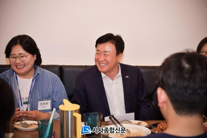 ½ÃÀå°ú Á÷¿ø°úÀÇ °ÝÀÇ ¾ø´Â ´ëȸ¦ À§ÇØ ½ÃûÀ» ¹þ¾î³ª ºê·±Ä¡ Ä«Æä¿¡¼ ÁøÇàµÈ °£´ãȸ¿¡¼ Á¤ ½ÃÀåÀº ¹Î¿ø ´ã´ç °ø¹«¿øÀÇ ¾Ö·Î»çÇ×À» Á÷Á¢ ûÃëÇÏ°í ³ë°í¸¦ °Ý·ÁÇß´Ù.