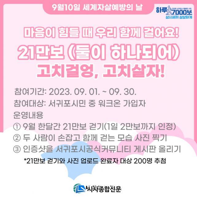 º¸°Ç¼Ò´Â Áö³ 1ÀϺÎÅÍ ÇÑ ´Þ°£ ¡ã ¸ð¹ÙÀÏ °È±â ¾Û(¿öÅ©¿Â)À» Ȱ¿ëÇÑ Àڻ쿹¹æÈ«º¸ 縰Áö ¡®¸¶À½ÀÌ Èûµé ¶§ ¿ì¸® ÇÔ²² °É¾î¿ä.¡¯¸¦ ½ÃÀÛÀ¸·Î Á¦ÁÖÆ¯º°ÀÚÄ¡µµ ±¤¿ªÁ¤½Å°Ç°º¹Áö¼¾ÅÍ¿Í °øµ¿ ÁÖ°üÇÏ¿© ¡ã 2023³â Àڻ쿹¹æÀÇ ³¯ ±â³ä °È±â Çà»ç ¡®°íÄ¡ °É¾û °íÄ¡ »ìÀÚ¡¯¸¦ ¿À´Â 9¿ù 9ÀÏ ¼±ÍÆ÷°¨±Ö¹Ú¹°°ü¿¡¼ °³ÃÖÇÒ ¿¹Á¤ÀÌ´Ù.
