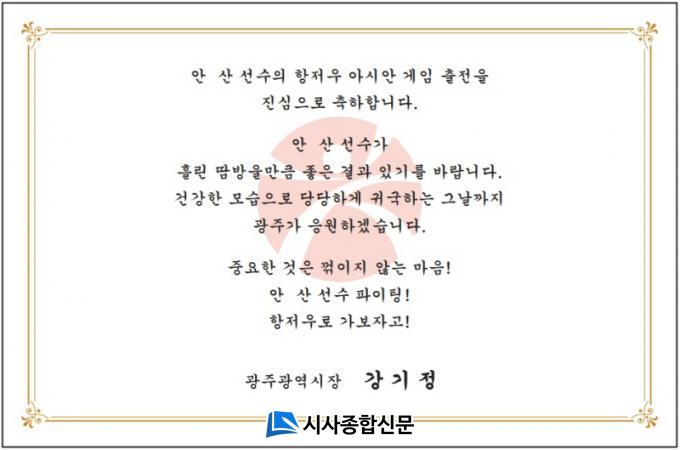 °±âÁ¤ ±¤ÁÖ±¤¿ª½ÃÀåÀÌ Ç×Àú¿ì ¾Æ½Ã¾È°ÔÀÓ ÃâÀü ±¤Áֽà ¼Ò¼Ó ±¹°¡´ëÇ¥ ¼±¼öµé¿¡°Ô ÀÀ¿øÀÇ ÆíÁö¸¦ º¸³Â´Ù.
