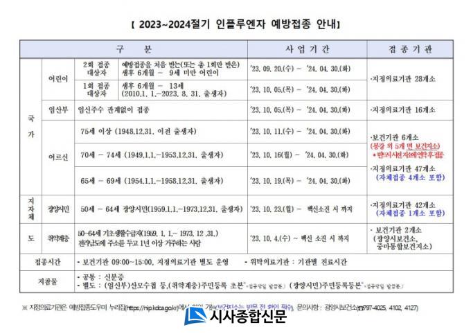 ¸ðµç Á¢Á¾Àº ÁöÁ¤ÀÇ·á±â°ü(¿¹¹æÁ¢Á¾µµ¿ì¹Ì ´©¸®Áý Âü°í)¿¡¼ ½Ç½ÃÇϸç, 65¼¼ ÀÌ»óÀº ¸é º¸°ÇÁö¼Ò(¡ãºÀ° 10¿ù 17ÀϺÎÅÍ ¸ÅÁÖ È, ±Ý ¡ã¿Á·æ 10¿ù 18ÀϺÎÅÍ ¸ÅÁÖ ¼ö, ¸ñ ¡ãÁø»ó 10¿ù 16ÀϺÎÅÍ ¸ÅÁÖ ¿ù ¡ã¿Á°î 10¿ù 19ÀϺÎÅÍ ¸ÅÁÖ ¸ñ, ±Ý ¡ãÁø¿ù 10¿ù 16ÀϺÎÅÍ ¸ÅÁÖ ¿ù~¸ñ ¡ã´Ù¾Ð 10¿ù 16ÀϺÎÅÍ ¸ÅÁÖ ¿ù, È, ¼ö)¿¡¼µµ Á¢Á¾ °¡´ÉÇÏ´Ù. ´Ü, Àü¶ó³²µµ »ç¾÷À¸·Î ½Ç½ÃÇÏ´Â ±âÃÊ»ýȰ¼ö±ÞÀÚ ´ë»ó Á¢Á¾Àº ±¤¾ç½Ãº¸°Ç¼Ò¿Í Á߸¶ÅëÇÕº¸°ÇÁö¼Ò 2°³¼Ò¿¡¼¸¸ °¡´ÉÇÏ´Ù.