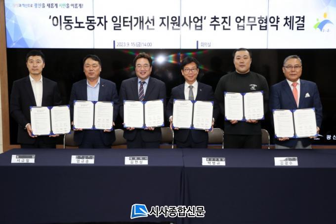±¤»ê±¸´Â 15ÀÏ ±¸Ã» 2Ãþ »óȲ½Ç¿¡¼ ±¤ÁÖ°æÁ¦ÁøÈï»ó»ýÀÏÀÚ¸®Àç´Ü(´ëÇ¥ÀÌ»ç ±èÇö¼º), ±¤ÁÖÀºÇà(ÀºÇàÀå °íº´ÀÏ), µµ·Î±³Åë°ø´Ü ±¤ÁÖ‧Àü³²ÁöºÎ(º»ºÎÀå ±è°æ¼®), ¶óÀÌ´õÀ¯´Ï¿Â(¹è´Þ³ëµ¿ÀÚ Çùµ¿Á¶ÇÕ) ±¤ÁÖ‧Àü³²ÁöºÎ(º»ºÎÀå ¹ÚâÇö, ¹úũĿÇÇ(ȸÀå ¼±ÔÀÏ) µî 5°³ ±â°ü‧´Üü¿Í ¡®À̵¿³ëµ¿ÀÚ ÀÏÅͰ³¼± Áö¿ø»ç¾÷ ÃßÁøÀ» À§ÇÑ ¾÷¹«Çù¾à¡¯À» ü°áÇß´Ù.