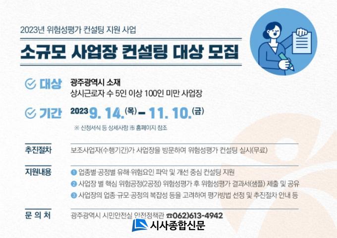| ±¤ÁÖ±¤¿ª½Ã, »êÀ翹¹æ À§ÇÑ À§Ç輺Æò°¡ ÄÁ¼³ÆÃ »ç¾÷ ÃßÁø ¡°»êÀ翹¹æ À§ÇÑ ÄÁ¼³ÆÃ ¹ÞÀ¸¼¼¿ä¡± 5ÀÎ ÀÌ»ó 100ÀÎ ¹Ì¸¸ ´ë»ó ¼Ò±Ô¸ð »ç¾÷Àå 50°÷ ¸ðÁý