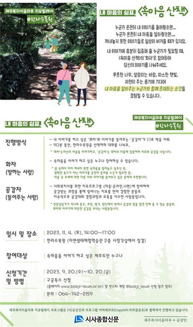 ÇÑÆí, <¼Ó¸¶À½ »êÃ¥>Àº (»ç)°ø°¨ÀÎÀÌ °³¹ßÇÏ¿© <¼¿ï½Ã¹ÎÈú¸µÇÁ·ÎÁ§Æ®>·Î ¿À·£±â°£ ¿î¿µµÇ¾î ¿Â ÇÁ·Î±×·¥À¸·Î, 2021³âºÎÅÍ Á¦ÁÖº¹ÁöÀÌÀ½¸¶·çÀÇ »çȸº¹Áö»ç Ä¡À¯È¸º¹ÇÁ·Î±×·¥À» ÇÔ²²Çϰí ÀÖ´Â (»ç)°ø°¨ÀÎÀÇ Áö¼ÓÀûÀÎ ÇÁ·Î±×·¥ Ä«ÇÇ·¹ÇÁÆ®(Copyleft:ÀúÀÛ±Ç °øÀ¯)·Î ÁøÇàµÈ´Ù.
