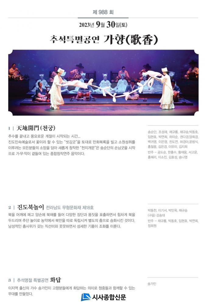 À̹ø °ø¿¬Àº Ãß¼®À» ¸Â¾Æ Á¾ÇÕâÀÛ¿¬ÁÖ À½¾ÇÀÎ ¡®ÃµÁö°³¹®(õ±Ã)¡¯, ¡®ÁøµµºÏ³îÀÌ¡¯, Ãß¼®¸íÀý Ưº°°ø¿¬ÀÎ ¡®È´ä¡¯ µî ´Ùä·Î¿î °ø¿¬À» ¼±º¸ÀÏ ¿¹Á¤ÀÌ´Ù.
