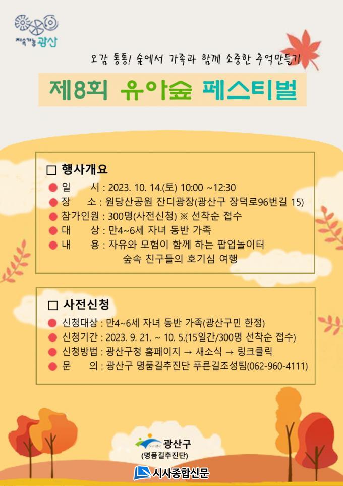 | ±¤Áֽà ±¤»ê±¸, Á¦8ȸ ¡®À¯¾Æ ½£ Æä½ºÆ¼¹ú¡¯ Âü¿©ÀÚ ¸ðÁý À¯¾Æ µ¿¹Ý °¡Á· 300¸í ¼±Âø¼ø¡¦10¿ù 14ÀÏ ¼ö¿Ï ¿ø´ç»ê°ø¿ø °³ÃÖ |