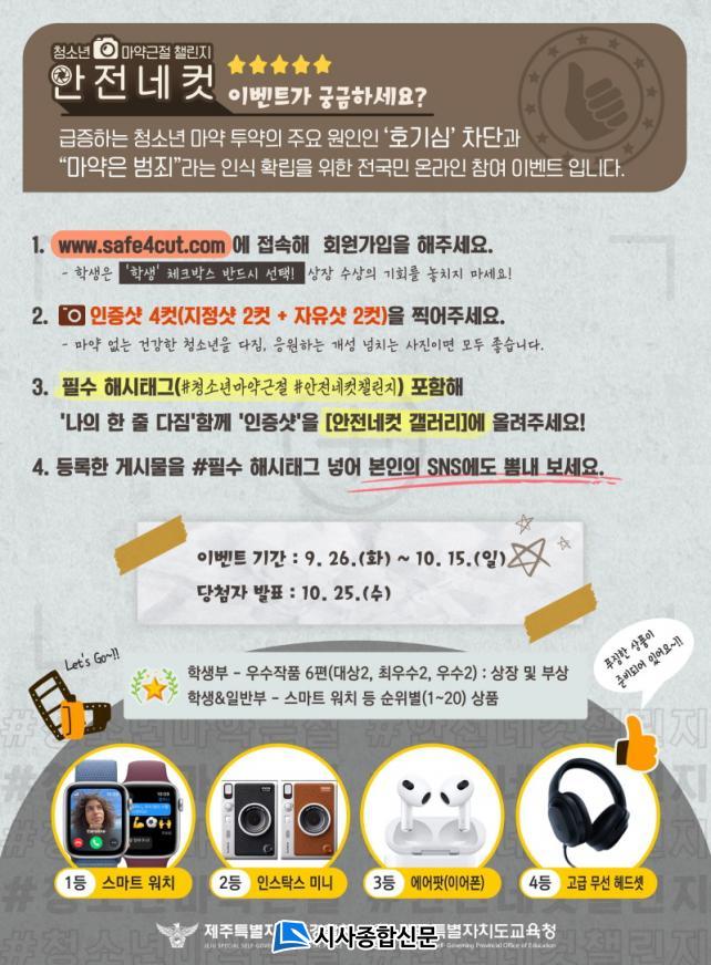 ±â°£Àº ÀÌ´Þ 26ÀϺÎÅÍ 10¿ù 15ÀϱîÁö 20Àϰ£ ÁøÇàµÇ¸ç, Âü¿© ¹æ¹ýÀº ¨ç Á¦ÁÖ°æÂûû¿¡¼ °³¼³ÇÑ È¨ÆäÀÌÁö(www.safe4cut.com)·Î Á¢¼Ó ¡æ ¨è ¾ÈÀü ³×ÄÆ »çÁø(ÁöÁ¤ Æ÷Á 2Àå, ÀÚÀ¯ »çÁø 2Àå) ÃÔ¿µ ¾÷·Îµå ¡æ ¨é ³ªÀÇ ÇÑÁÙ ´ÙÁü ÀÛ¼º, °Ô½Ã±ÛÀ» ¾÷·Îµå ÇÏ¸é µÇ¸ç Á¦ÁÖ°æÂûû º°µµ °³¼³ ȨÆäÀÌÁö¸¦ ÅëÇØ ¸¶¾à »ó´ã ¹× ½Å°í¿Í ¿¹¹æ ±³À°ÀÚ·á µîÀ» ÇÑ °÷¿¡¼ È®ÀÎÇÒ ¼ö ÀÖ´Ù.