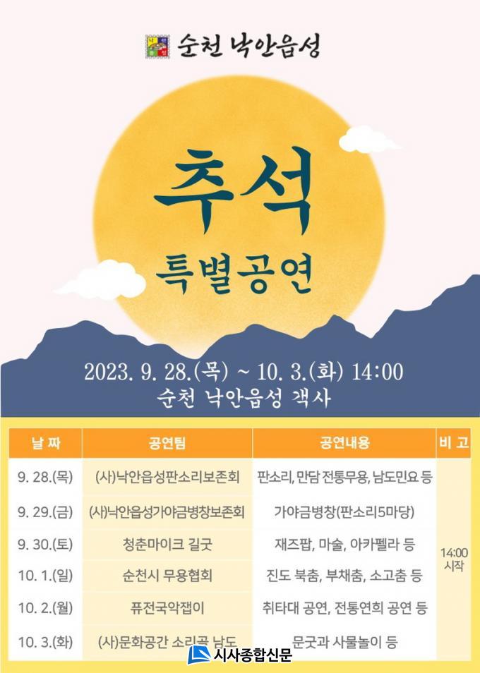 [½Ã»çÁ¾ÇսŹ® = Àå¹Î±Ô ±âÀÚ] ¼øÃµ½Ã(½ÃÀå ³ë°ü±Ô)´Â ¼øÃµ ³«¾ÈÀ¾¼º¿¡¼ ¿À´Â 28ÀϺÎÅÍ ´ÙÀ½ ´Þ 3ÀϱîÁö ¼øÃµ ³«¾ÈÀ¾¼º °´»ç¿¡¼ Ãß¼® Ưº° °ø¿¬À» ¿ÀÈÄ 2½Ã¿¡ ¿î¿µÇÑ´Ù.