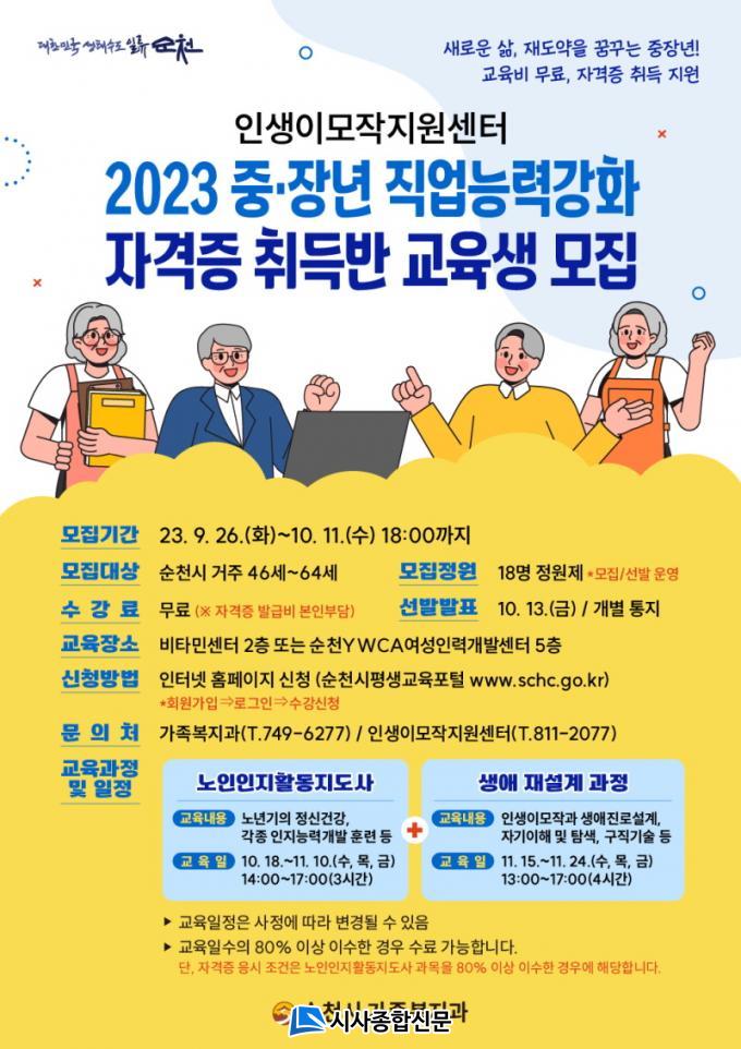 ¼øÃµ½Ã(½ÃÀå ³ë°ü±Ô)´Â Áß¡¤Àå³âÀ» ´ë»óÀ¸·Î Á÷¾÷Àü¹® ´É·Â °È¸¦ À§ÇÑ ÀÚ°ÝÁõ Ãëµæ¹Ý(³ëÀÎȰµ¿Áöµµ»ç)À» °³¼³Çϰí 10¿ù 11ÀϱîÁö ±³À° ¼ö°»ý(18¸í)À» ¸ðÁýÇÑ´Ù°í ¹àÇû´Ù.