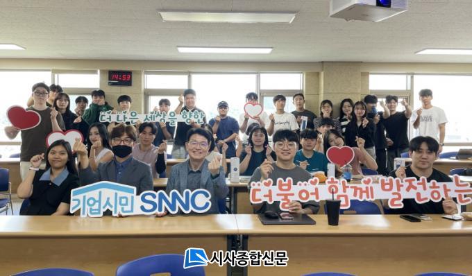 Áö³´Þ 19ÀÏ¡¸Áö¼Ó°¡´É¼º°ú ESG¡¹ ¼ö¾÷ÀÇ ÀÏȯÀ¸·Î ¿¸° Ư°¿¡¼´Â SNNCÀÇ µÎÁøÈ« °æ¿µÁö¿ø½ÇÀåÀÌ °¿¬¿¡ ³ª¼¹´Ù. À̳¯ Ư°¿¡¼´Â SNNC ±â¾÷°ú ±â¾÷ ½Ã¹ÎÀÇ °³³äÀ» ¼Ò°³Çϰí, SNNCÀÇ Áö¼Ó°¡´É¼º°ú ESG°æ¿µ»ç·ÊµéÀ» ¼Ò°³ÇØ ÇлýµéÀÇ ¸¹Àº È£ÀÀÀ» À̲ø¾î ³Â´Ù.