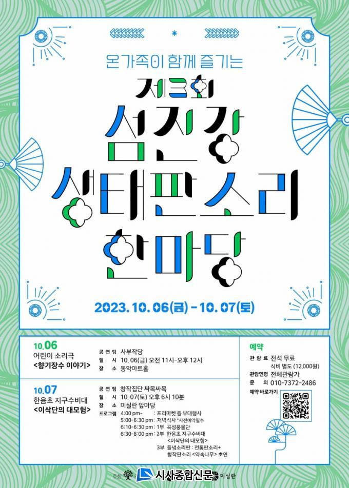 ¡®Á¦3ȸ ¼¶Áø° »ýÅ ÆÇ¼Ò¸® ÇѸ¶´ç¡¯Àº 10¿ù 6ÀÏ¿¡´Â ¿ÀÀü 11½Ã, 10¿ù 7ÀÏ¿¡´Â ¿ÀÈÄ 6½Ã 10ºÐ¿¡ ÁøÇàµÈ´Ù. Àü Á¼® ¹«·á·Î ÁøÇàµÇ¸ç ½Ä»çºñ´Â º°µµ´Ù. °ø¿¬ ¿¹¾àÀº Æ÷½ºÅÍ¿¡ ÀÖ´Â QRÄڵ带 ½ºÄµÇϰųª, ±¸±Û Æû(https://forms.gle/BZ9EgpmXyGwvKEAz8)À¸·Î Á¢¼ÓÇØ ½ÅûÇÏ¸é µÈ´Ù.