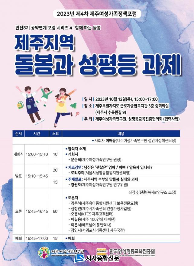 [½Ã»çÁ¾ÇսŹ® = °í¼º¹Î ±âÀÚ] Á¦ÁÖ¿©¼º°¡Á·¿¬±¸¿øÀº 10¿ù 12ÀÏ(¸ñ) ¿ÀÈÄ 3½ÃºÎÅÍ Á¦ÁÖÆ¯º°ÀÚÄ¡µµ ±Ù·ÎÀÚÁ¾ÇÕº¹Áö°ü 3Ãþ ÁßȸÀǽǿ¡¼ ¡°Á¦ÁÖÁö¿ª µ¹º½°ú ¼ºÆòµî °úÁ¦¡±¶ó´Â ÁÖÁ¦·Î Á¦4Â÷ Á¦ÁÖ¿©¼º°¡Á·Á¤Ã¥Æ÷·³À» °³ÃÖÇÑ´Ù. À̹ø Æ÷·³Àº ¶ÇÇÑ ¼ºÆòµî±³À°ÁøÈïÇùÀÇȸ Çù·Â»ç¾÷À¸·Î ÃßÁøµÈ´Ù.