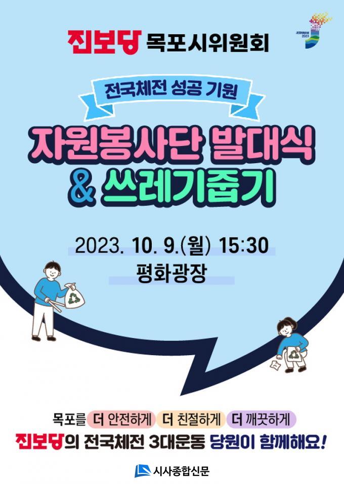 [½Ã»çÁ¾ÇսŹ® = ¿À½ÂÅà ±âÀÚ] Áøº¸´ç ¸ñÆ÷½ÃÀ§¿øÈ¸´Â ¿À´Â 10¿ù 9ÀÏ(¿ù) ¿ÀÈÄ 3½Ã 30ºÐ Æòȱ¤Àå¿¡¼ ¡®´õ ¾ÈÀüÇÏ°Ô ´õ Ä£ÀýÇÏ°Ô ´õ ±ú²ýÇϰԡ¯±¸È£¸¦ ³»°É°í Àü±¹Ã¼Àü ¼º°ø°³ÃÖ¸¦ ±â¿øÇϸç Áøº¸´ç ÀÚ¿øºÀ»ç´Ü ¹ß´ë½ÄÀ» °®°í Æòȱ¤Àå ÀÏ´ë ¾²·¹±âÁݱ⠽ÇõȰµ¿ µî Ä·ÆäÀÎÀ» ÁøÇàÇÕ´Ï´Ù.