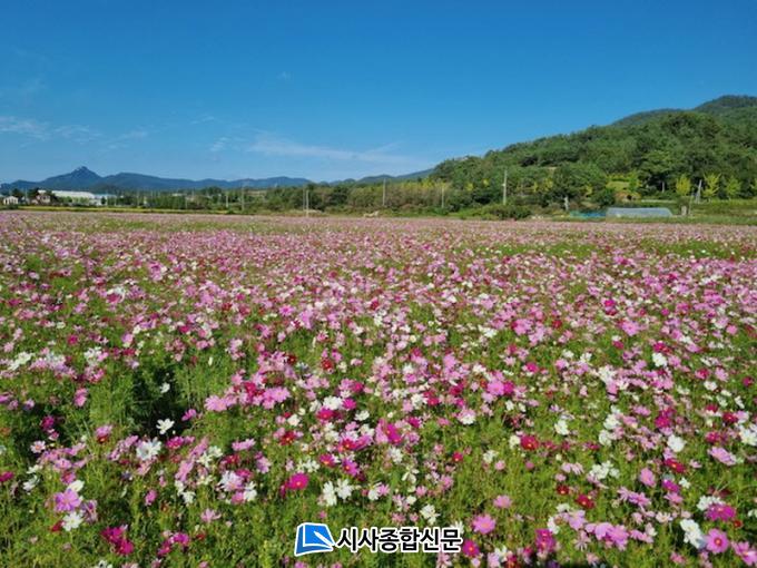 ȼø±º ³ó¾÷±â¼ú¼¾ÅÍ´Â ³óÃÌÀÇ °æ°üÀ» ¾Æ¸§´ä°Ô À¯ÁöÇϱâ À§ÇÏ¿© À¯ÈÞÁö¸¦ Á¤ºñÇϰí ÄÚ½º¸ð½º¸¦ ÆÄÁ¾ÇØ ²É´ÜÁö¸¦ Á¶¼ºÇß´Ù. ²É´ÜÁö°¡ Á¶¼ºµÈ Áö¿ªÀº Ãá¾ç¸é ¼®Á¤¸® 112¹øÁö ÀÏ´ë(0.5ha), À̾ç¸é ¿À·ù¸® 571¹øÁö ÀÏ´ë(2.7ha)·Î ÃÑ 3.2ha¿¡ ´ÞÇÏ´Â ¸éÀû¿¡ ÄÚ½º¸ð½º°¡ ¹°°áÄ¡µí Àå°üÀ» ÀÌ·ç°í ÀÖ´Ù.