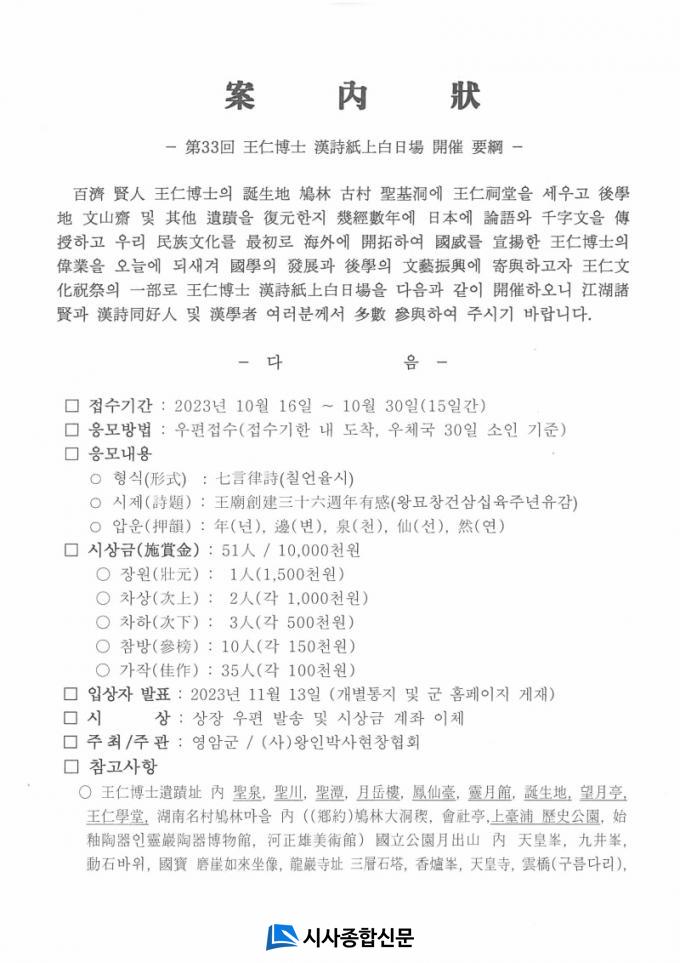 ¹éÀÏÀåÀÇ ½ÃÁ¦´Â èÝÙÙóÜËïß²ä¨×¿ñÎÒ´êóÊï(¿Õ¹¦Ã¢°Ç»ï½ÊÀ°ÁÖ³âÀ¯°¨), ¾Ð¿îÀº Ò´(³â)¡¤Ü«(º¯)¡¤ô»(õ)¡¤à¹(¼±)¡¤æÔ(¿¬), Çü½ÄÀº Ä¥¾ðÀ²½Ã´Ù. ÀÛǰ ¿øº» Á¢¼ö´Â ¿ìÆíÀ¸·Î ¹Þ°í, ÁÖ¼Ò´Â ¿µ¾Ï±º ±º¼¸é ¿ÕÀηΠ440¹øÁö ¿µ¾Ï±ºÃ¢Àǹ®È»ç¾÷¼Ò´Ù.