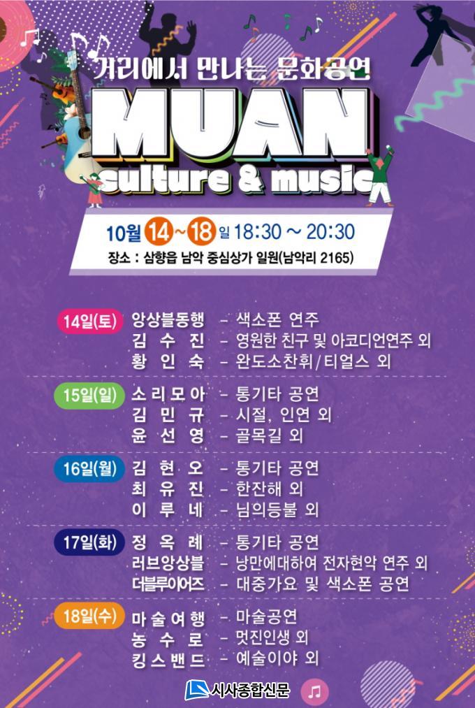 [½Ã»çÁ¾ÇսŹ® = ¿À½ÂÅà ±âÀÚ] ¹«¾È±º(±º¼ö ±è»ê)Àº ¿À´Â 14ÀÏ(Åä)ºÎÅÍ 18ÀÏ(¼ö)±îÁö 5Àϰ£ ³²¾Ç Áß½É»ó°¡ ÀÏ¿ø(³²¾Ç¸® 2165)¿¡¼ ¡®°Å¸®¿¡¼ ¸¸³ª´Â ¹®È°ø¿¬¡¯À» ½ÃÇàÇÑ´Ù. ³²¾Ç Áß½É»ó°¡ ÀÏ¿ø¿¡ ÀÖ´Â ³²¾Ç½Åµµ½Ã ¸íǰ°Å¸® Á¶Çü¹° ¾Õ¿¡¼ ´ëÁß°¡¿ä, ±âŸ ¹× »ö¼ÒÆù ¿¬ÁÖ, ¸¶¼ú°ø¿¬ µî ´Ù¾çÇÑ °ø¿¬ÀÌ ÆîÃÄÁø´Ù.