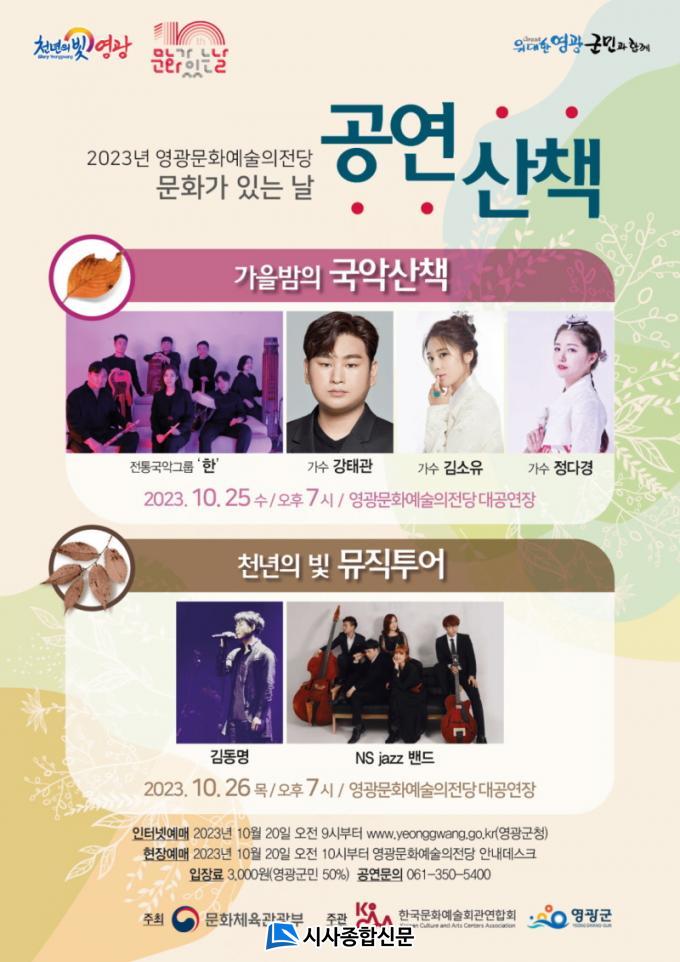 [½Ã»çÁ¾ÇսŹ® = ¿À½ÂÅà ±âÀÚ] ¿µ±¤±º(±º¼ö °Á¾¸¸)Àº ¿À´Â 10¿ù 25ÀÏ(¼ö), 26ÀÏ(¸ñ) ¿ÀÈÄ 7½Ã¿¡ 2Àϰ£ ¿µ±¤¹®È¿¹¼úÀÇÀü´ç ´ë°ø¿¬Àå¿¡¼¡®2023 ¹®È°¡ ÀÖ´Â ³¯ °ø¿¬»êÃ¥¡¯À¸·Î¡®°¡À»¹ãÀÇ ±¹¾Ç»êÃ¥¡¯°ú ¡®Ãµ³âÀǺû ¹ÂÁ÷Åõ¾î¡¯¸¦ °ø¿¬ÇÑ´Ù.